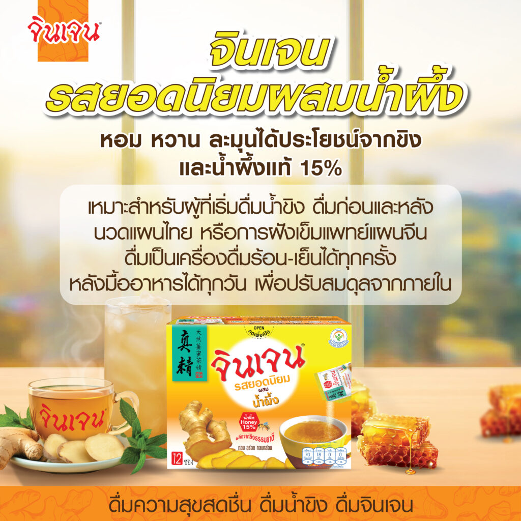 ขิงผสมน้ำผึ้ง สัมผัสความหอมหวาน อร่อย กลมกล่อม ดื่มง่าย เปี่ยมไปด้วยคุณค่าของขิงแก่สดคุณภาพเยี่ยมที่ผ่านการคัดสรรอย่างพิถีพิถันในทุกๆ ขั้นตอน ตามแบบฉบับเฉพาะของจินเจน สร้างประสบการณ์การดื่มน้ำขิงไปอีกระดับ ด้วยการผสานรสชาติขิงที่ผ่านการปรุงพิเศษ และความหอมหวานของน้ำผึ้งแท้จากธรรมชาติ ซึ่งทำหน้าที่ช่วยชูรสชาติของเครื่องดื่มขิงชั้นดีให้กลมกล่อม ดื่มง่าย และชุ่มคอในทุกสัมผัส