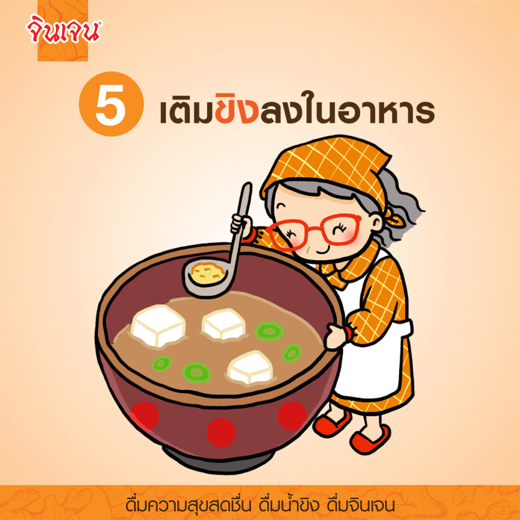 5. นอกจากดื่มน้ำขิงเป็นประจำแล้ว ควรพยายามเติมขิงผงลงในอาหารแต่ละมื้อด้วย ลองเติมขิงบด หรือ ขิงผงลงในอาหาจำพวกซุป อาหารประเภทเส้น ต้มหรือตุ๋น ก็ได้รสชาติอร่อยไปอีกแบบ